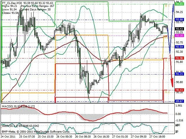 Předpokládaný pohyb pro dnešní den LONG. Případné vstupy do obchodu z hladiny 92 s předpokládaným cílem 94.65 případně až 95.7. Proražení hladiny 92 může vést k pohybu s pravděpodobným cílem 90.65 až 90.