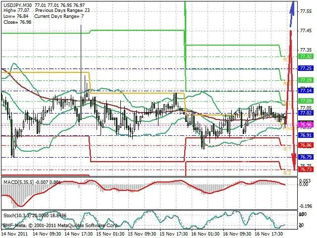 Předpokládaný pohyb pro dnešní den SHORT. Případné vstupy do obchodu z hladiny 77.45 s předpokládaným cílem 76.75, případně až 76.5. Proražení hladiny 77.45 může vést k pohybu s pravděpodobným cílem 77.9 až 78.3.
