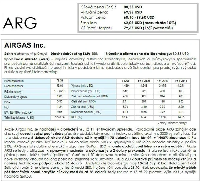 Airgas je největší americký distributor svářečských, lékařských či průmyslových speciálních plynových bomb a příslušných zařízení. Akcie se vrátila k srpnovým maximům, dokonce je o 2 dolary překonaly. Titul se stal technicky poměrně překoupeným, takže pondělní "pullback" těsně pod 70 USD byl vítaným oddechem a příležitostí pro nové investory vstoupit do long pozic na "příjemnějších" úrovních.