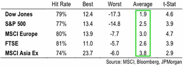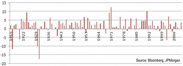 Americký trh dnes zůstane zavřený. V posledních dnech investorům akcie velkou radost nedělají, do konce roku ovšem může být všechno jinak. Jak ukazují grafy z dílny JPMorgan, akcie se v drtivé většině případů po Dnu díkůvzdání nadechnou k růstu do konce roku. Ukazuje to tabulka průměrných výnosů světových indexů. Nejvýmluvnější je graf výnosů indexu Dow Jones Industrial Average mezi Dnem díkůvzdání a koncem roku - ve výrazné většině let jsou výnosy kladné.