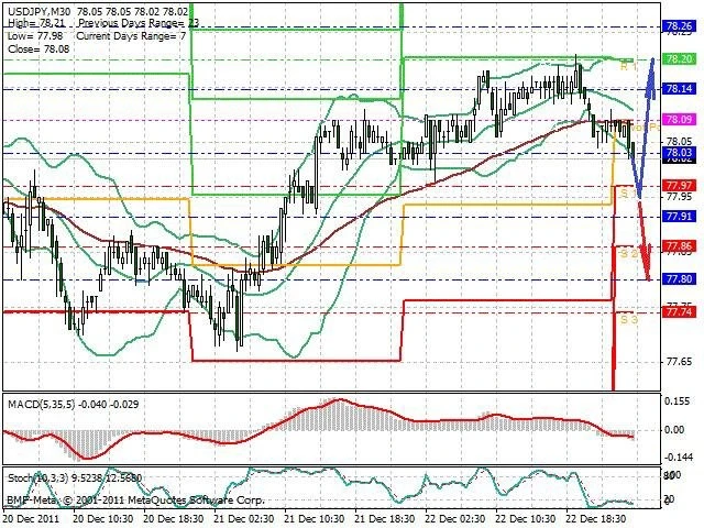 Předpokládaný pohyb pro dnešní den LONG. Případné vstupy do obchodu z hladiny 77.95 s předpokládaným cílem 78.2, případně až 78.35. Proražení hladiny 77.95 může vést k pohybu s pravděpodobným cílem 77.8 až 77.65.