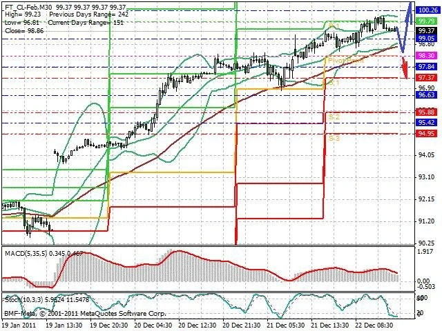 Předpokládaný pohyb pro dnešní den LONG. Případné vstupy do obchodu z hladiny 98.4 s předpokládaným cílem 100.5 případně až 101.4. Proražení hladiny 98.4 může vést k pohybu s pravděpodobným cílem 97.55 až 96.75.