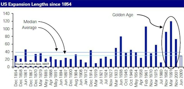 Historie se nezdá být na straně těch, kdo varují před návratem recese do Spojených států v roce 2012. Průměrné hospodářské oživení v USA od roku 1854 trvá 40 měsíců, od Velké deprese dokonce 58 měsíců. Současná ekonomická expanze trvá zatím jen 27 měsíců. Podle analytiků Deutsche Bank jsou ovšem předchozí tři ekonomické růsty ve Spojených státech svou délkou naprosto abnormální, což silně zahýbalo s průměrnými čísly. Zajímavější je tak možná hodnota mediánu, které se probíhající růst ve Spojených státech nebezpečně blíží.