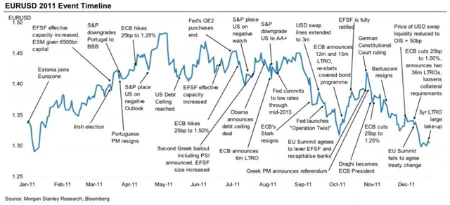 Takový spořádaný kopeček - i tak by se dal popsat vývoj kurzu nejobchodovanějšího měnového páru v roce 2011. Vstup Estonska do eurozóny na začátku roku, snížení ratingu USA, a nakonec vyostření dluhové krize v Evropě. Přehled nejdůležitějších událostí na evropské i americké scéně, které hýbaly kurzem eurodolaru, v přehledném grafu z dílny analytiků Morgan Stanley.