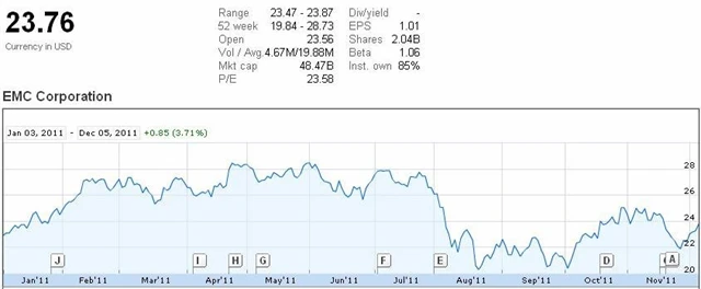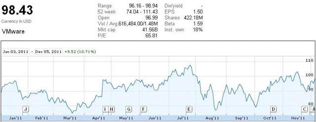 Akcie VMware v roce 2011 přidaly přes 10 %. V posledních třech letech je trend ještě pozitivnější, když je průměrné zhodnocení přes 60 %.
