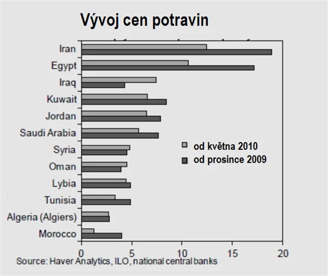 Nepokoje v Egyptě nabírají na intenzitě. Političtí komentátoři jako jeden z důvodů masových protestů uvádějí růst životních nákladů v zemi, kde 40 procent populace musí "přežít" jen s pár dolary na den. Jak dokládá přiložený graf, Egypt není jedinou rozvíjející se ekonomikou v regionu, kde inflace v cenách potravin rapidně vystřelila nahoru. Navíc v zemích, jako jsou Egypt, Írán, Alžírsko nebo Tunisko, mají potraviny dominantní postavení v inflačním koši.