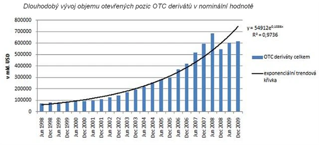 Pokud analyzujeme statistiku vývoje OTC derivátů prostřednictvím průzkumu prováděným Bankou pro mezinárodní platby v tříletém cyklu, pak žádný pokles v objemu otevřených pozic nezaznamenáme. Navzdory propadům spojeným s finanční krizí OTC trh od posledního průzkumu v roce 2007 vzrostl celkem o 15 %. To znamená růst v průměru 5 % ročně. V období 2004 až 2007 byl tento průměrný roční růst 32 %! To poukazuje na rapidní zpomalení růstu otevřených pozic OTC derivátů v nominálních hodnotách.