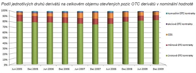 OTC deriváty dlouhodobě tvoří více než 80 % všech derivátů. V letech 2007 a 2008 svou pozici ještě posilovaly až k hranici 90 %. Nic na tom nezměnila ani finanční krize. Jejich vývoj tak nadále zůstává stěžejním pro vývoj derivátů jako celku. Tuto domněnku potvrzuje i shodná podoba vývoje objemů otevřených pozic OTC s celkovými deriváty.