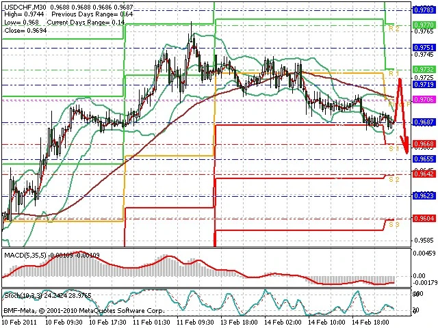 Předpokládaný pohyb pro dnešní den SHORT. Případné vstupy do obchodu z hladiny 0.9725 s předpokládaným cílem 0.965, případně až 0.962. Proražení hladiny 0.9725 může vést k pohybu s pravděpodobným cílem 0.9745 až 0.9775.