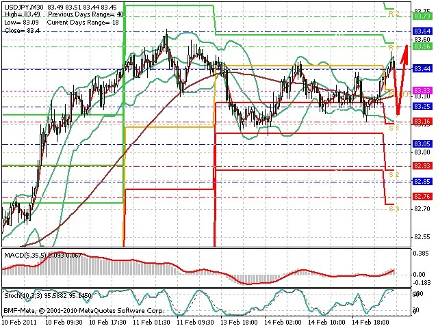 Předpokládaný pohyb pro dnešní den LONG. Případné vstupy do obchodu z hladiny 83.2 s předpokládaným cílem 83.7, případně až 83.95. Proražení hladiny 83.15 může vést k pohybu s pravděpodobným cílem 82.8 až 82.5.