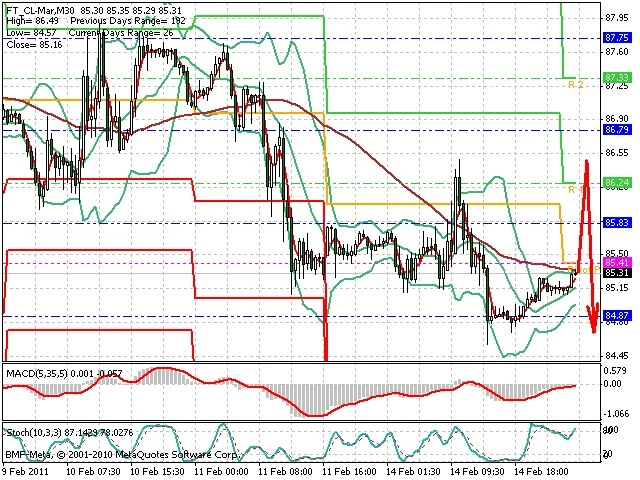 Předpokládaný pohyb pro dnešní den SHORT. Případné vstupy do obchodu z hladiny 86.5 s předpokládaným cílem 83.5, případně až 82. Proražení hladiny 86.5 může vést k pohybu s pravděpodobným cílem 87.9 až 88.5.