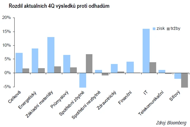 Tržby ve 4. kvartálu meziročně vzrostly o 8,6 % a překonávají odhady trhu asi o 2 %. Tempo růstu je srovnatelné s 3. kvartálem. Poměr pozitivních překvapení u zisků dosahuje 71 %, což je v souladu s trendovou linií za posledních deset let.