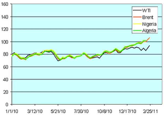 Až donedávna byl rozdíl mezi cenami ropy typu Brent (Severní moře) a WTI (USA) velice malý, řádově pár dolarů. Události v Egyptě a hlavně v Lybii však způsobily velký rozdíl mezi těmito cenami, který v jednu chvíli dosáhl téměř 16 dolarů.