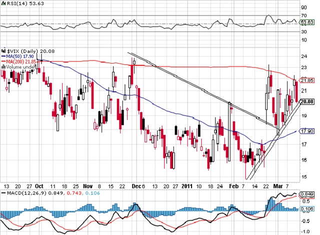 Index volatility VIX nepřekonal únorové vystřelení nad hladinu 23. Začal vytvářet rostoucí trendovou čáru a páteční pokles ji potvrdil. Důležité jsou nyní dvě hladiny: 23 a 19. Po jejich překonání se situace může přiklonit na býčí stranu pro akcie (pokles VIX pod úroveň 19), nebo medvědí stranu (růst nad 23).