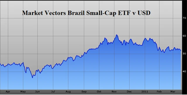 Market Vectors Brazil Small Cap ETF se vydařil rok 2010. Nedávná korekce představuje důležitý impuls pro nové investory. Jedna až dvě ostré korekce za rok jsou vcelku normální jev při pokračujícím býčím trendu. Vzhledem k současné geopolitické situaci se můžeme připravit na silnější vzestupný trend.