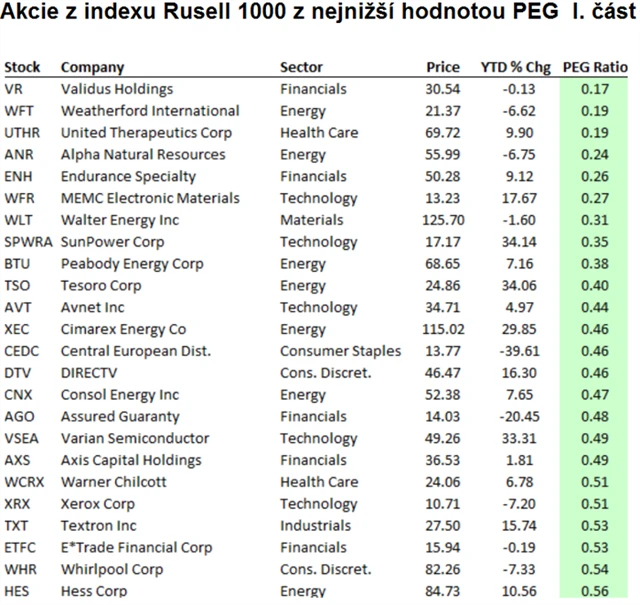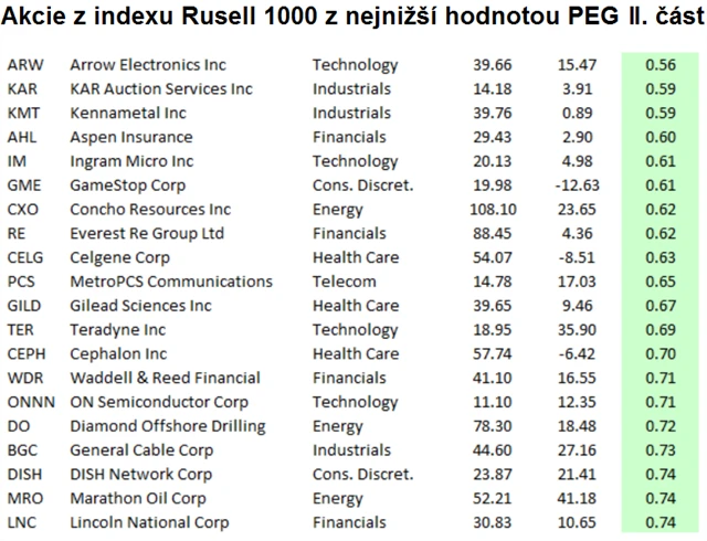 Investoři porovnávají cenu akcií podle řady poměrových ukazatelů. Velmi populární je tzv. indikátor PEG, který porovnává tržní cenu s očekávaným růstem - například v nadcházejících pěti letech. Stejně jako u indikátoru P/E (poměr tržní ceny vůči čistému zisku) platí, že nižší hodnota je atraktivnější. U PEG je za zajímavou považována hodnota nižší než 1, pod 0,75 se dá mluvit již o signálu k nákupu a pod 0,33 by vás od nákupu již nemělo odradit vůbec nic.