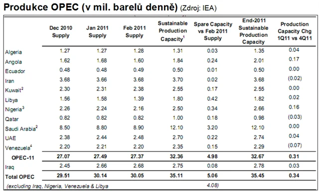 Obzvláště citlivě je vnímána situace v Libyi, kde se demonstrace přelily v občanskou válku. Do konfliktu se zapojilo i NATO. V prvních fázích byl výsledkem výpadek produkce ve výši 75 % z 1,6 mb/d. Na situaci zareagovala Saúdská Arábie, která přislíbila nahradit výpadek těžby ze svých rezervních kapacit a zvýšila produkci. OPEC jako celek nesvolal mimořádné zasedání a oficiálně ponechal limity těžby nezměněny. Saúdská Arábie nicméně produkci zvýšila, aby nahradila výpadky z Libye. Je pravděpodobné, že kartel v červnu na svém zasedání oficiálně zvýší limity těžby. V únoru těžil OPEC 30,05 mb/d. V lednu se produkce pohybovala na úrovni 30,14 mb/d. Užší jádro kartelu (11 zemí) těžilo v únoru 27,37 mb/d. Celková rezervní kapacita OPEC (po vyloučení Iráku, Nigérie, Venezuely a Libye) činí aktuálně 4,08 mb/d, přičemž Saúdská Arábie disponuje 80 % ve výši 3,2 mb/d. To je nejnižší úroveň od roku 2008. Celosvětová nabídka se pohybuje na úrovni 89 mb/d, což je meziroční růst o 2,2 mb/d. Celková nabídka mimo kartel OPEC se v únoru pohybovala na úrovni 53,2 mb/d.