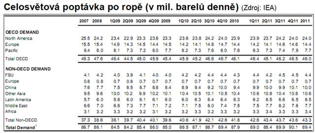 Celosvětová spotřeba by se v roce 2011 měla pohybovat na úrovni 89,4 mb/d. V roce 2010 se pohybovala na 87,9 mb/d. Poptávka v rámci zemí OECD se v roce 2010 pohybovala na úrovni 46,1 mb/d. V roce 2011 by se měla pohybovat na úrovni 46,0 mb/d. V případě zemí mimo OECD se poptávka v roce 2010 pohybovala na úrovni 41,8 mb/d. V roce 2011 se očekává 43,3 mb/d.