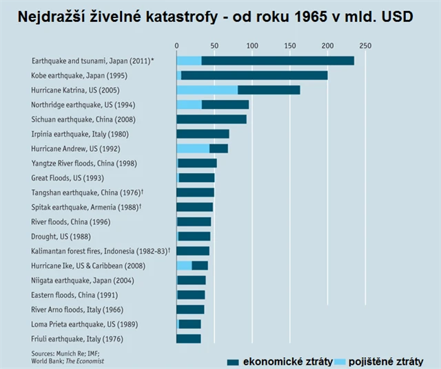 Japonské zemětřesení je zatím jednoznačně nejdražší živelnou pohromou v novodobé historii. Odhad zajišťovny Munich Re hovoří o částce 230 miliard dolarů, nové odhady, jež zveřejnila agentura Reuters, mluví o tom, že se celkový účet za tuto přírodní katastrofu může vyšplhat až na 330 miliard dolarů.