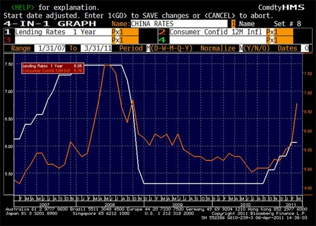 Nyní přeskočme do roku 2011. Máme tu Čínu, která prudce zvedá požadavky na bankovní rezervy a úrokové sazby, aby zabránila dopadu inflace na ekonomiku – daleko napřed po trajektorii, po níž se nyní pohybuje také ECB a za kterou daleko vzadu pokulhává Fed. Čína přešla do režimu zpřísňování měnové politiky a je v tomto ohledu napřed před ostatními.