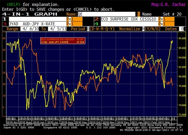 V níže uvedeném grafu jsem použil index překvapení Citigroup (na Bloomberg INDEX CESIG10). Povšimněte si téměř dokonalé korelace mezi carry trade obchody a ekonomickými výsledky až do 11. března, kdy japonská tragédie tento vztah pravděpodobně nabourala.