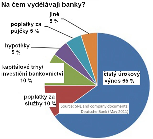 Pro mnohé to bude rychlé přelouskání louskání slabikáře, ale ani tak nezaškodí si připomenout, na čem že to stojí příjmy bankovního sektoru. Z grafu je patrné, že dominantní položkou pro zisky bank jsou čisté úrokové výnosy, které v průměru zajišťují dvě třetiny příjmů.