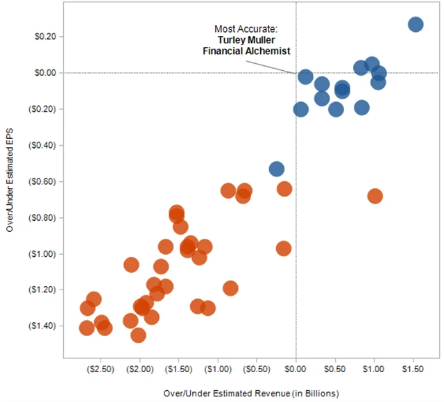 Optimisté byli blíže realitě než pesimisté. Přiložený graf jasně ukazuje, že modří (bloggeři) byli blíže jak v odhadech tržeb (vodorovná osa), tak zisku na akcii (svislá osa).