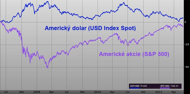 Takže máme v jednom velkém kotli zpomalující růst ekonomiky a bublinu na dolarových aktivech. Od srpna přitom akcie posílily zhruba o čtvrtinu. Jenomže kolik za tu dobu ztratil zmíněný americký dolar?