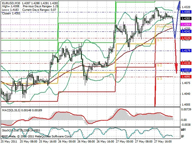 Předpokládaný pohyb pro dnešní den LONG. Případné vstupy do obchodu z hladiny 1.422 s předpokládaným cílem 1.435, případně až 1.4425. Proražení hladiny 1.421 může vést k pohybu s pravděpodobným cílem 1.415 až 1.4125.