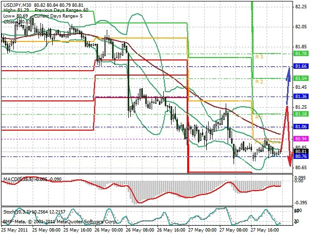 Předpokládaný pohyb pro dnešní den SHORT. Případné vstupy do obchodu z hladiny 81.25 s předpokládaným cílem 80.7, případně až 80.5. Proražení hladiny 81.3 může vést k pohybu s pravděpodobným cílem 81.65 až 81.8.