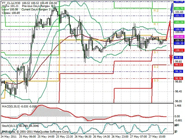 Předpokládaný pohyb pro dnešní den SHORT. Případné vstupy do obchodu z hladiny 101.25 s předpokládaným cílem 99.5, případně až 97.85. Proražení hladiny 101.25 může vést k pohybu s pravděpodobným cílem 102 až 103.5.