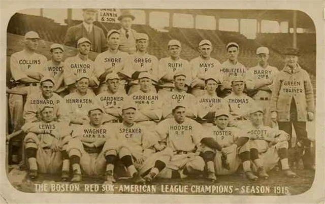 Pohlednice Boston Red Sox z roku 1915, včetně baseballové legendy Babe Rutha