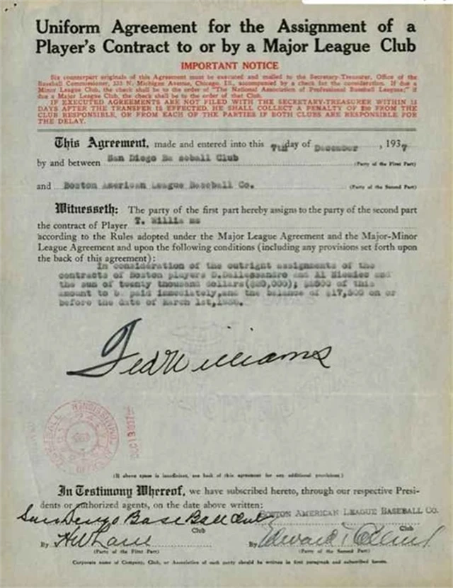 Podepsaná profesionální smlouva Teda Williamse z roku 1937