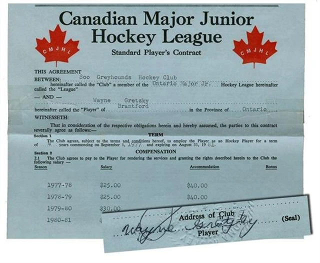 Podepsaná juniorská smlouva Wayna Gretzkého z roku 1977