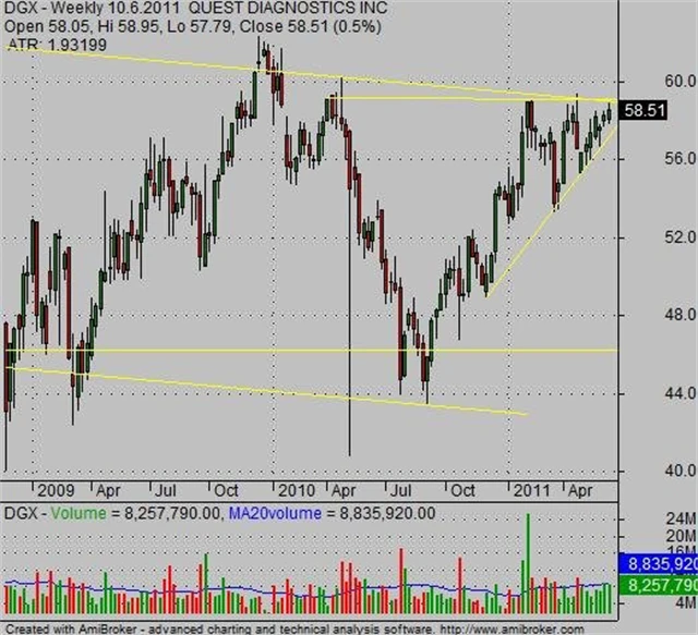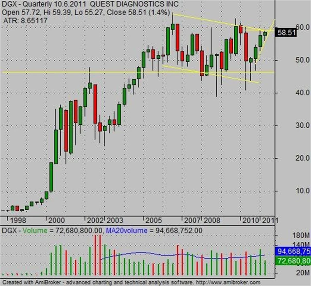 Akcie Quest Diagnopstics mají nejen dobrý fundamentální základ, ale také se v současné chvíli pohybují na zajímavých cenových hladinách. Klíčová je hodnota rezistence u 59 USD. V případě překonání této hranice se nabízí otevřené pole růstu nejen k hodnotám posledních maxim u 65 USD, ale i do nových absolutních maxim. Akcie nabízí jak krátkodobý, tak dlouhodobý investiční potenciál. Samozřejmě je nutné aplikovat příslušná pravidla pro řízení rizika, zejména stop loss.