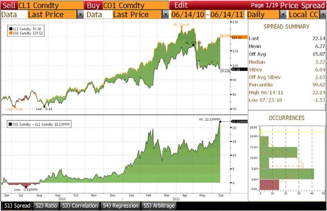Spread by se měl vrátit do okolí 15 USD a v delším horizontu díky obnovení těžby v Libyi a vybudování ropovodů z Cushingu by se měl vrátit až k nule (to ovšem může trvat jeden až dva roky).