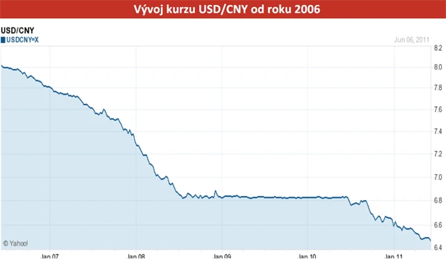 USA proto začaly silný politický nátlak na uvolnění kurzu čínského jüanu. Částečné zlepšení situace nastalo teprve minulé léto, kdy Čína opravdu nechala kurz své měny mírným tempem posilovat. **Za poslední rok posílil kurz jüanu vůči dolaru zhruba o 5 procent. Podle parity kupní síly, která srovnává hodnotu koše zboží dle směnných kurzů, se však jüan stále nachází více než 40 procent pod svoji férovou hodnotou.