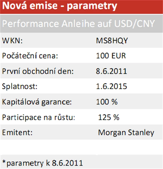 Šance pro nové investory tak přichází až v těchto dnech, kdy banka Morgan Stanley oznámila novou emisi garantovaného certifikátu, který stejně jako jeho předchůdci umožňuje i drobným investorm vydělat na posílení čínského jüanu vůči dolaru. Certifikát nabízí očekávanou stoprocentní garanci navrácení vloženého kapitálu při splatnosti a možnost vydělat na posilování kurzu čínské měny s pákou 125 procent.
