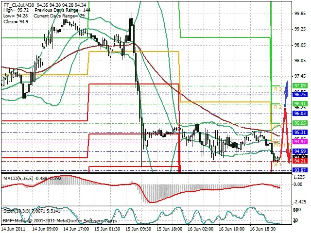 Předpokládaný pohyb pro dnešní den SHORT. Případné vstupy do obchodu z hladiny 96.2 s předpokládaným cílem 94.15, případně až 91.75. Proražení hladiny 96.2 může vést k pohybu s pravděpodobným cílem 97.1 až 98.71.