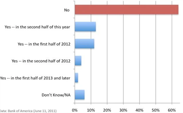 Za pár dní skončí druhé kolo kvantitativního uvolňování. Bude Fed pokračovat v odkupech dluhopisů, aby podpořil ekonomiku čerstvými penězi? Bank of America oslovila investiční profesionály - a jejich odpověď je jasná - NEBUDE! Skoro dvě třetiny s dalším kolem kvantitativního uvolňování nepočítá vůbec, zbytek je rozdělen podle toho, kdy by další kolo QE mělo začít.