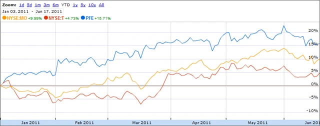Pfizer navzdory letošnímu růstu cen akcií o 15 % stále nabízí 4% dividendu, AT&T nebo Altria (tabáková společnost) dokonce lákají více než 5% dividendovým výnosem.