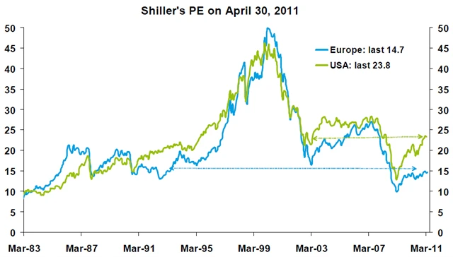 Evropské akcie nabízejí oproti těm americkým výraznou změnu. Vyplývá to z dlouhodobého vývoje P/E, tedy poměru ceny akcie a zisku na akcii. Americké akcie jsou aktuálně vysoko nad svým mediánem (21,3), ty evropské naopak hluboko pod ním (19,3). "Sleva" u evropských akcií oproti americkým je 38 %, nejvíce v historii. To je velice atraktivní, ovšem v Evropě také hrozí pomalejší růst a bankroty zemí eurozóny. Sázka na dlouhodobou statistiku ovšem hovoří jasně pro evropské akcie.