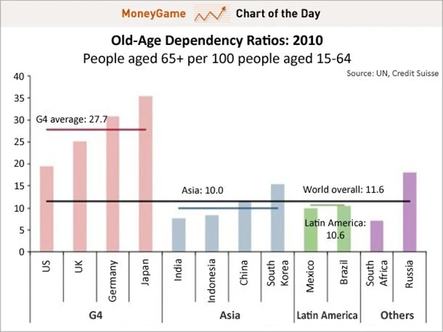 Demografové a ekonomové mají řadu společných témat. Pro odhad budoucího růstu ekonomiky je velice důležitá demografická struktura obyvatelstva. Podíl lidí nad 65 let vůči počtu ekonomicky aktivních (15-64 let) je proto velice zajímavým vodítkem pro odhad vývoje hospodářství. Graf z dílny Credit Suisse jasně ukazuje, že nejhůře jsou na tom nejvyspělejší země světa, konkurenční výhodu mají naopak země asijské.