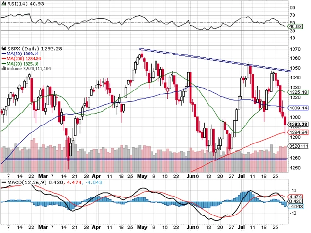 Potom ale bude na pořadu dne sledování slábnoucí ekonomiky a dalších ekonomických údajů. Graf indexu S&P 500 prolomil 20 a 50denní klouzavé průměry a intradenně se dotkl 200denního klouzavého průměru. Tím se změnil z býčího náhledu na neutrální. Cena v pátek uzavřela také pod hladinou 1300 na trendové čáře, která je spojnicí nízkých cen ze srpna 2010 a v červnu 2011. Nejbližší hladina podpory je v oblasti 1250-1260.