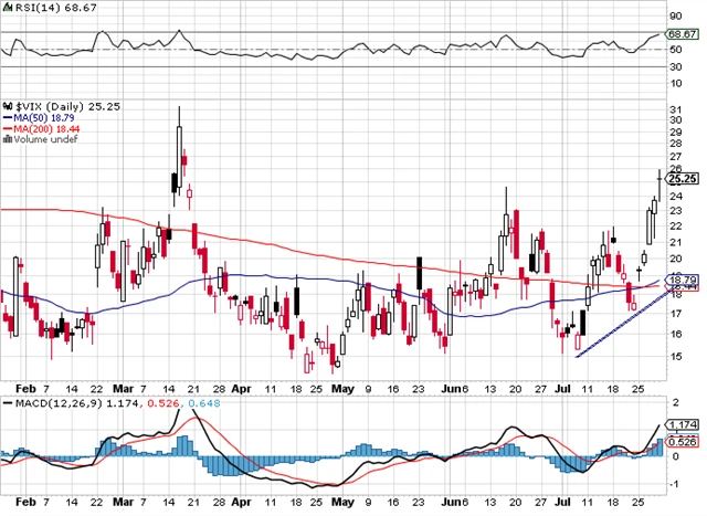 Nervozita na trzích se projevila na indexu volatility Vix, který celý týden vytvářel na grafu vyšší ceny, než byly v předcházejícím dni (higher highs a higher lows). To je medvědí náhled pro akcie.