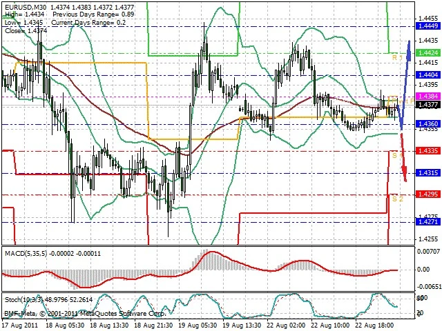 Předpokládaný pohyb pro dnešní den LONG. Případné vstupy do obchodu z hladiny 1.4355 s předpokládaným cílem 1.4435, případně až 1.4475. Proražení hladiny 1.4345 může vést k pohybu s pravděpodobným cílem 1.43 až 1.427.