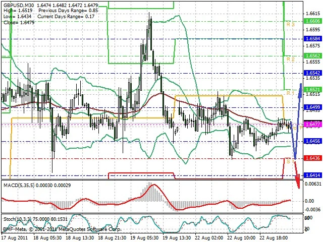 Předpokládaný pohyb pro dnešní den LONG. Případné vstupy do obchodu z hladiny 1.6435 s předpokládaným cílem 1.6525, případně až 1.655. Proražení hladiny 1.6425 vést k pohybu s pravděpodobným cílem 1.6375 až 1.632.