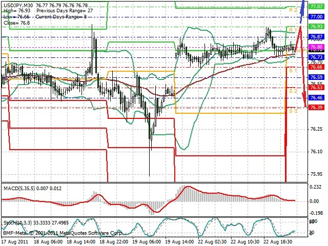 Předpokládaný pohyb pro dnešní den SHORT. Případné vstupy do obchodu z hladiny 76.95 s předpokládaným cílem 76.4, případně až 76. Proražení hladiny 77 může vést k pohybu s pravděpodobným cílem 77.5 až 77.9.