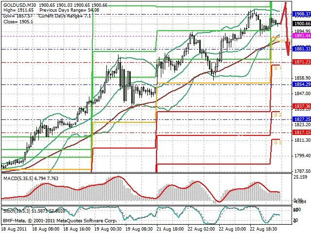 Předpokládaný pohyb pro dnešní den SHORT. Případné vstupy do obchodu z hladiny 1 920 s předpokládaným cílem 1 880, případně až 1 857. Proražení hladiny 1 920 může vést k pohybu s pravděpodobným cílem 1 940 až 1 983.