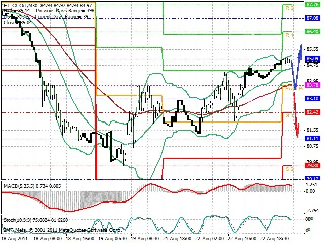 Předpokládaný pohyb pro dnešní den LONG. Případné vstupy do obchodu z hladiny 82.7 s předpokládaným cílem 85.7, případně až 87. Proražení hladiny 82.7 může vést k pohybu s pravděpodobným cílem 81.15 až 79.35.